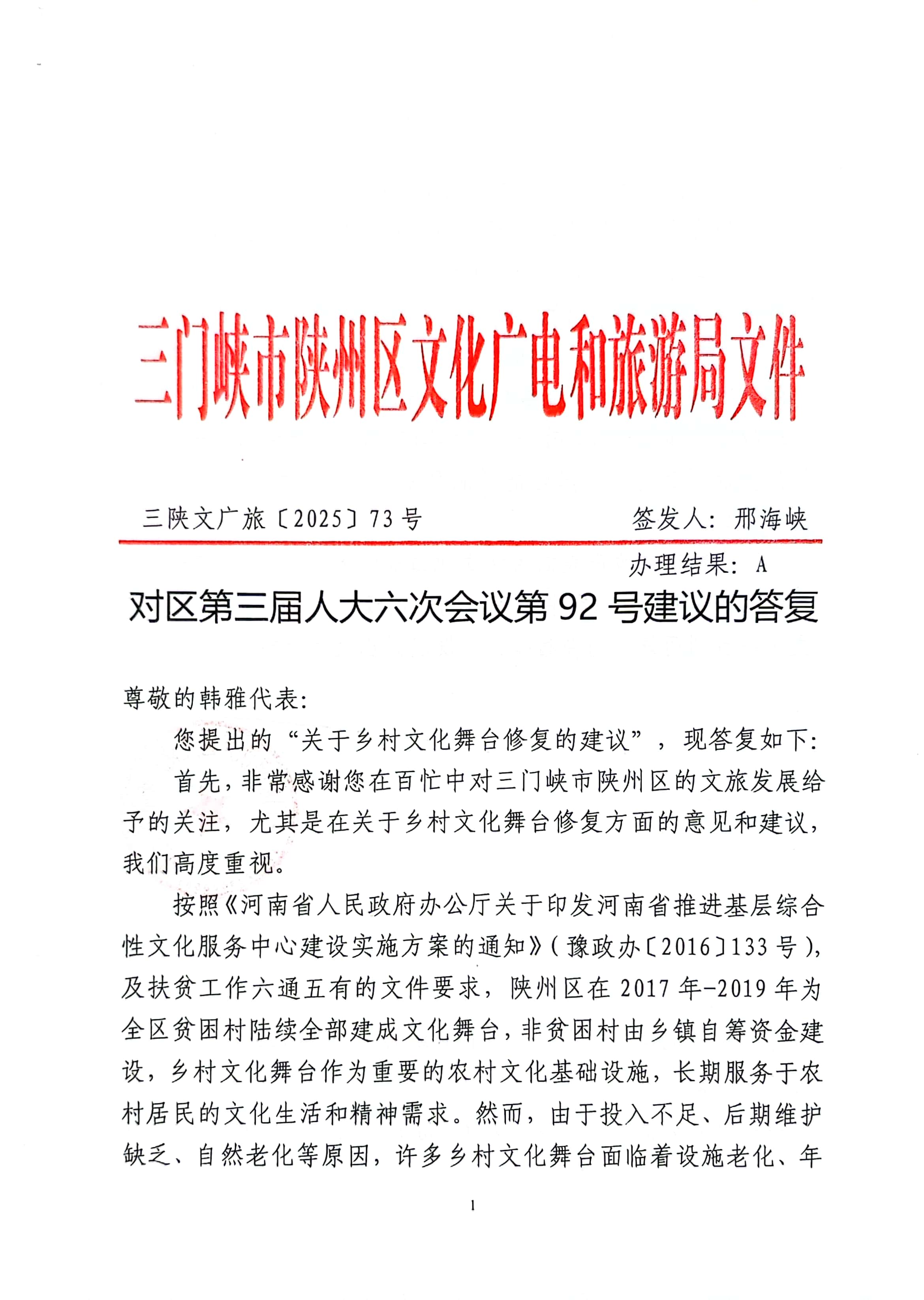 对区三届人大六次会议第92号建议的答复