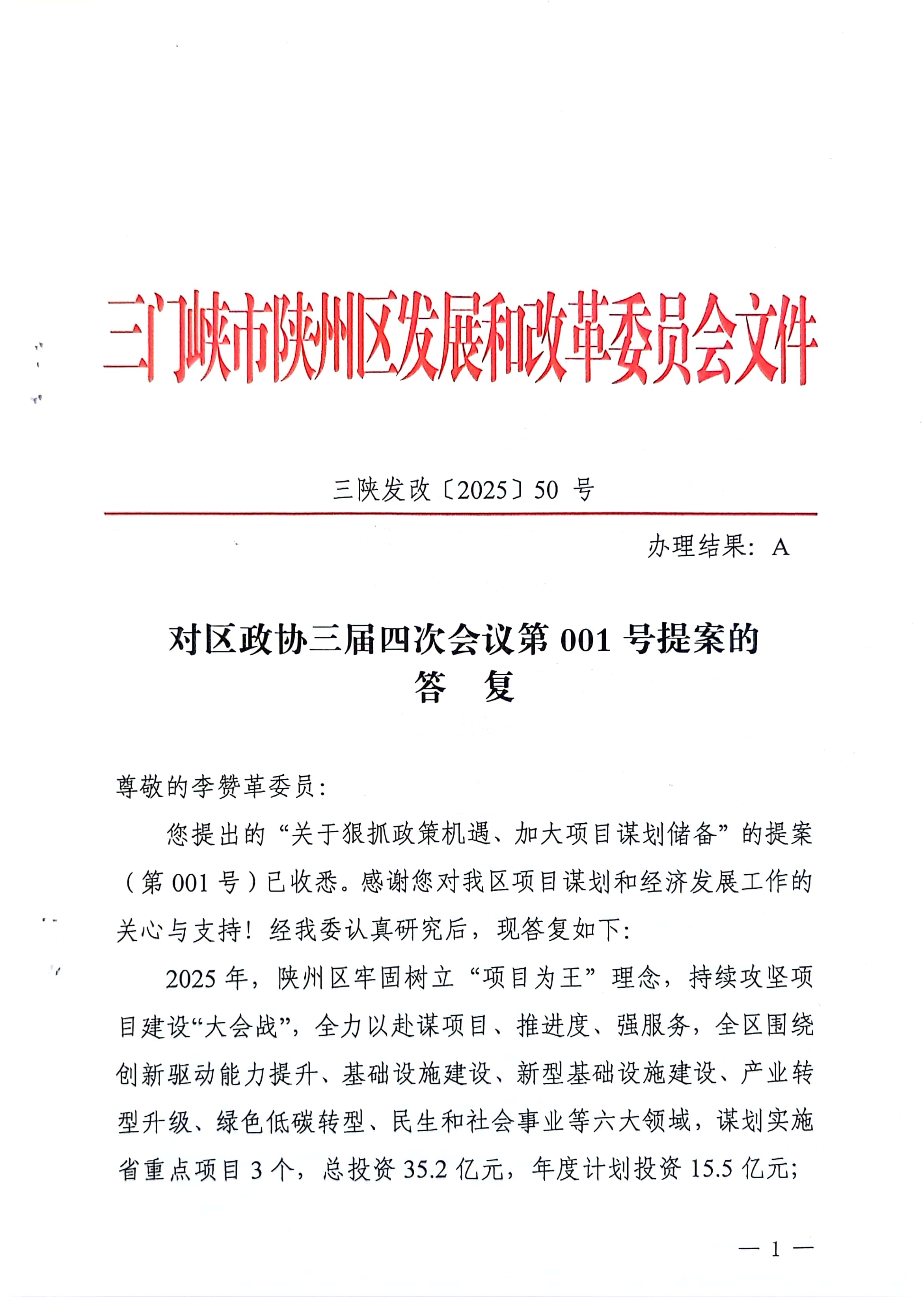 对区政协三届四次会议第001号提案的答复