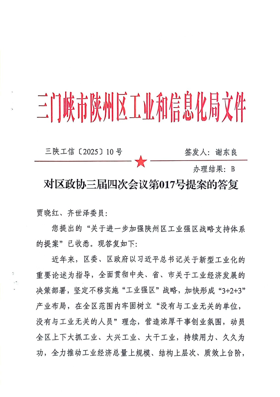 对区政协三届四次会议第017号提案的答复