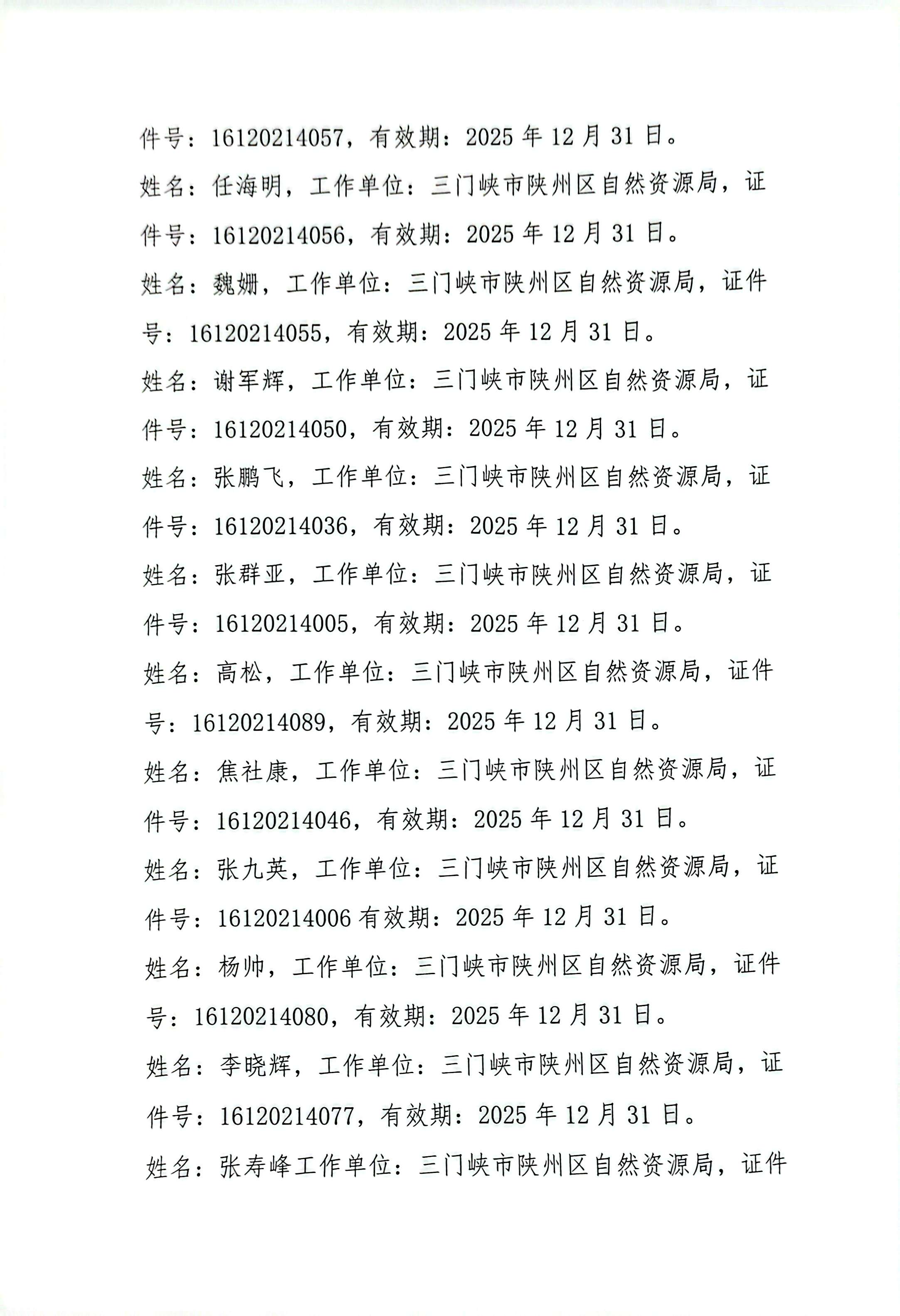 姓名:张寿峰工作单位:三门峡市陕州区自然资源局,证件号:16120214038,有效期:2025年12月31日。